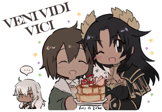 Veni vidi vici (I came, I saw, I conquered) is one of Caesar's most famous quotes. Other stuff was in the air such as alea iacta est (the die is cast), but I liked veni vidi vici for a few reasons; I like that the abbreviation is simple and that the meaning fits into the story pretty well.-Why can't Caesar read or write in English?